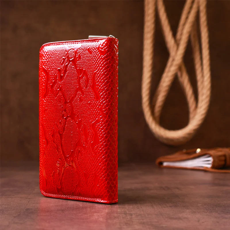 Лакований жіночий гаманець-клатч, з натуральної фактурної шкіри під рептилію. Такий гаманець дуже місткий, в нього легко поміщається мобільний телефон, документи та інші дрібниці. Відмінна ідея для подарунка, яка не залишить байдужою жодну жінку.