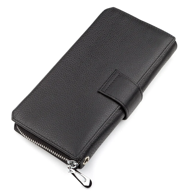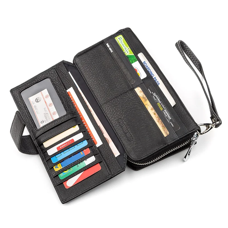 Представлена модель має класичний дизайн, виконаний в чорному кольорі з використанням зносостійкої і якісної шкіри, доповненої всередині текстильною підкладкою. Місткість гаманця відмінна, а окремий блок слотів для платіжних карток дозволяє вміщати цілих 20 візиток, дисконтних і банківських карт. Додатково є прилеглі кишені, прозорі відділи для документів і відділ на блискавці для дрібниці з іншими невеликими предметами. У комплектації є ремінець на зап'ястя і красива коробка.