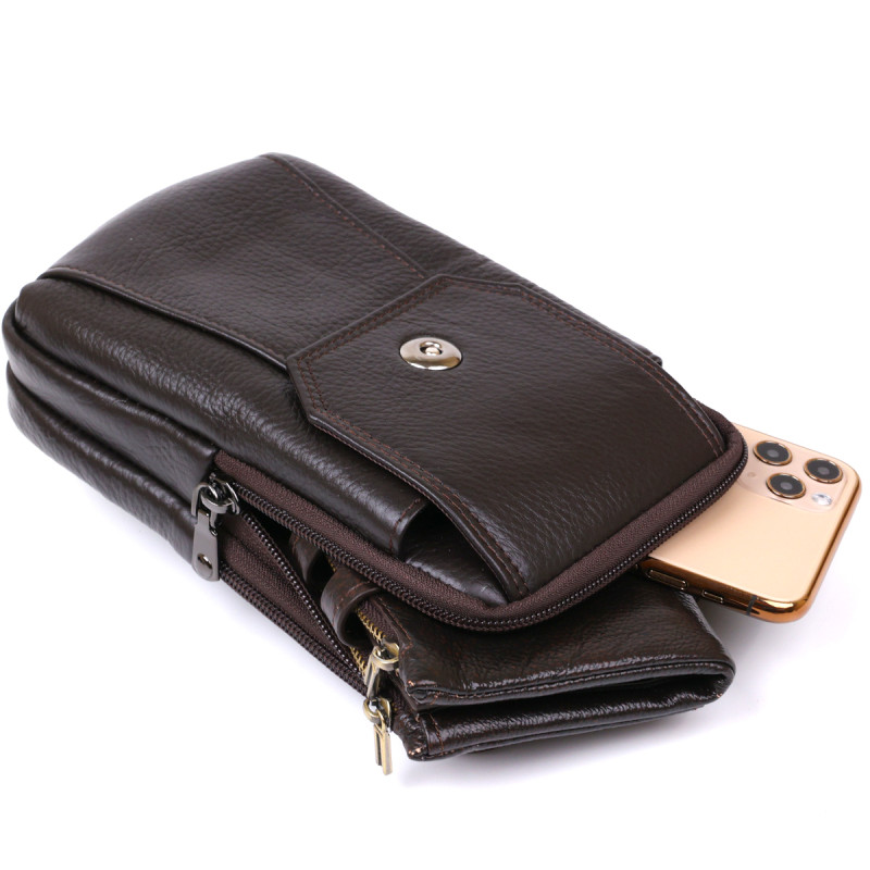 Відмінна сумка, що кріпиться на ремінь. Виконано модель із високоякісної натуральної шкіри з підвищеними показниками зносостійкості. Має два основних відділення та додаткову кишеню для швидкого доступу до вмісту на магнітній кнопці. Колір виробу – коричневий, фактура – зерниста і дуже приємна на дотик.